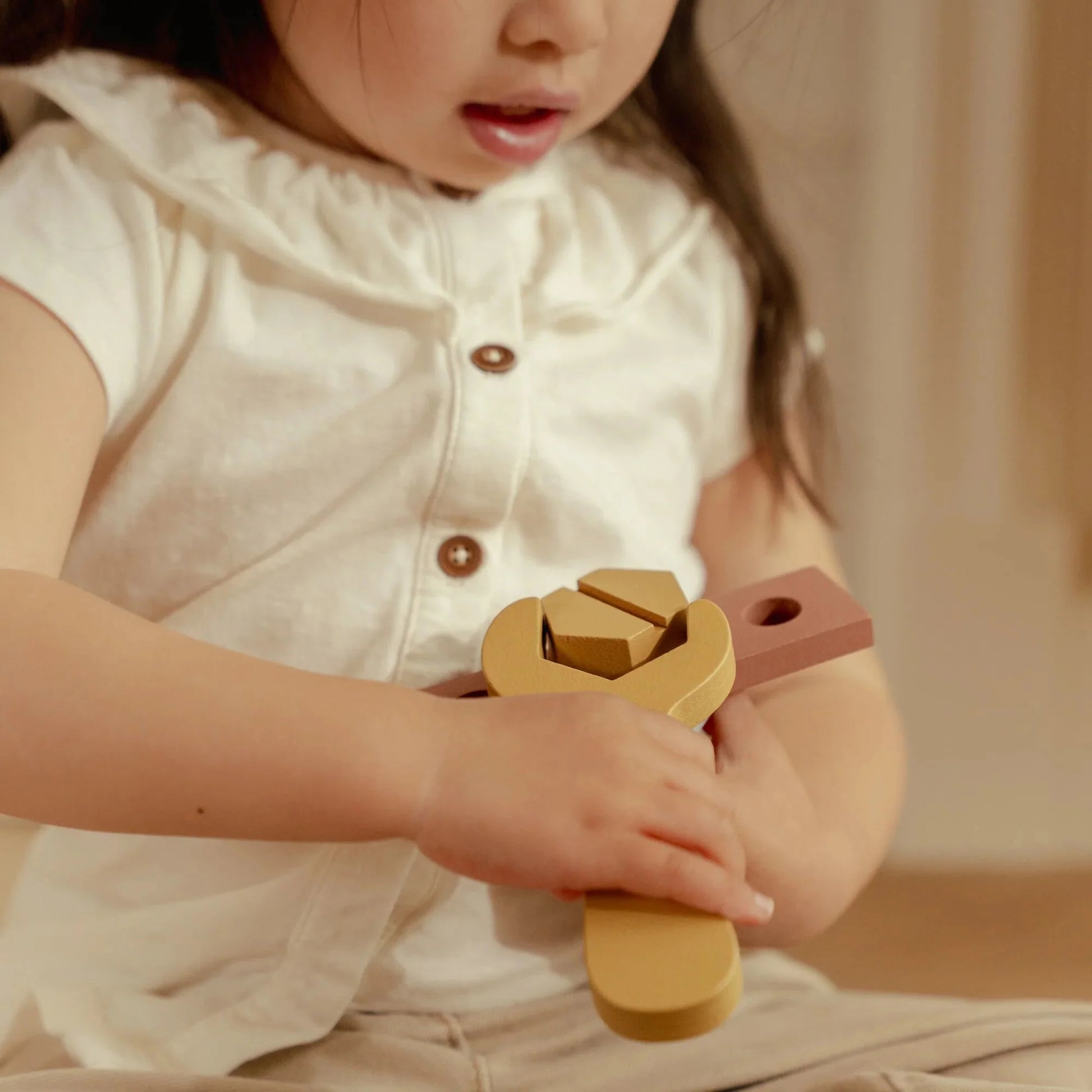 Оваа дрвена кутија со алати содржи чекан, шрафцигер и клуч - совршени за создавање разни креации. Но тоа не е сè - страните на кутијата можат да се користат и како површина за чукање! Така, децата можат да чукаат и завртуваат додека преку игра ја развиваат својата моторика и креативност.