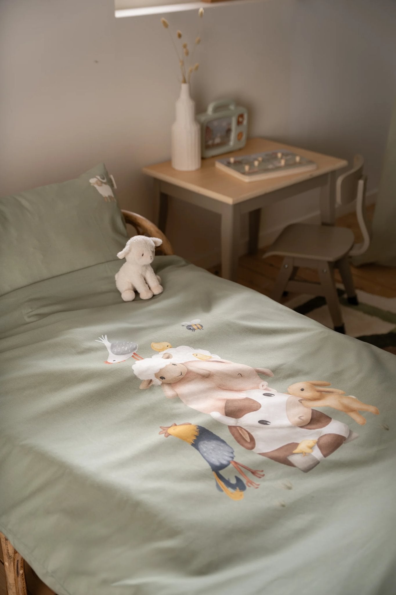 Додајте топлина и шарм во детската соба со ова прекрасно зелено сетче постелнина од колекцијата Little Farm. Изработено е од 100% органски памук, меко и пријатно за нежната бебешка кожа. Декоративниот дезен со животни и детали од фармата внесува радост и игра во секојдневието, додека практичниот дизајн овозможува лесно одржување.