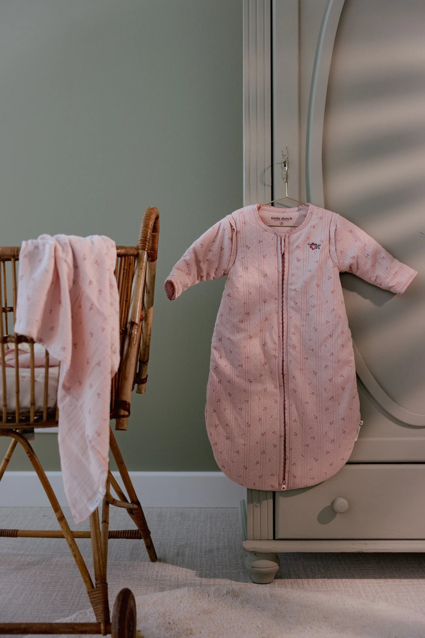 Нежната розе нијанса внесува природна хармонија, а малото везено цвеќенце додава слатка декоративна нота. Патентот се затвора надолу и е покриен и од внатрешната и од надворешната страна за дополнителна безбедност и заштита. Вреќата е Oeko-Tex сертифицирана и достапна во должини од 70 cm и 90 cm.